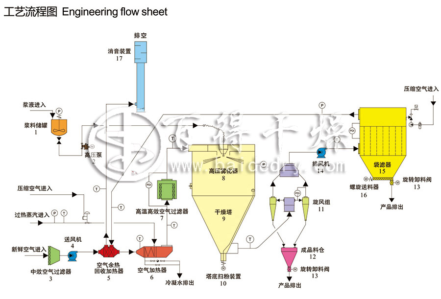 ⑤ 設計了合理的主塔直筒體的高徑比,以保證物料足夠的停留時間,保證噴霧干燥效果。