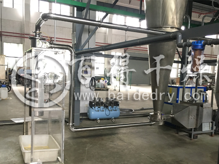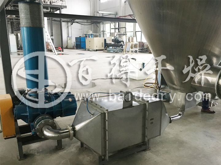 集中收料:主機及旋風分離器下料均由冷凍除濕后的冷空氣氣力輸送到另外旋風下料,直接包裝,尾氣進入一級旋風分離器。