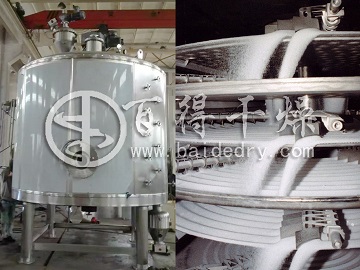 筒體中被干燥的物料在耙齒軸有規律的攪拌下,周而復始,直至物料被干燥到工藝要求。內筒體上部安置有真空接口,接入真空系統,使被干燥物料在負壓下加熱干燥,可保證干燥物料在低溫下加熱,不致破壞物料的物化性質。物料達到干燥要求后,打開筒體下部的放料閥,讓物料在耙齒軸的攪拌下向中間移動進行出料。 耙葉與主軸成45°~60°夾角,被干燥物料在中心主軸驅動的攪拌耙桿的機械作用下,邊軸向來回翻動混合,邊被耙葉刮到筒體內壁上,容易產生結塊,而影響傳熱效果。 |