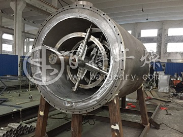 ② 槳葉形狀為楔形的空心半圓形,可以通入加熱介質。除了起攪拌作用外,也是設備的的傳熱體。槳葉的兩主要傳熱側面成斜面,因此當物料與斜面接觸時,隨著葉片的旋轉,顆粒很快就從斜面滑開,使傳熱表面不斷更新,強化了傳熱。 攪拌、混合使物料劇烈翻動,從而獲得更高的傳熱系數。 |