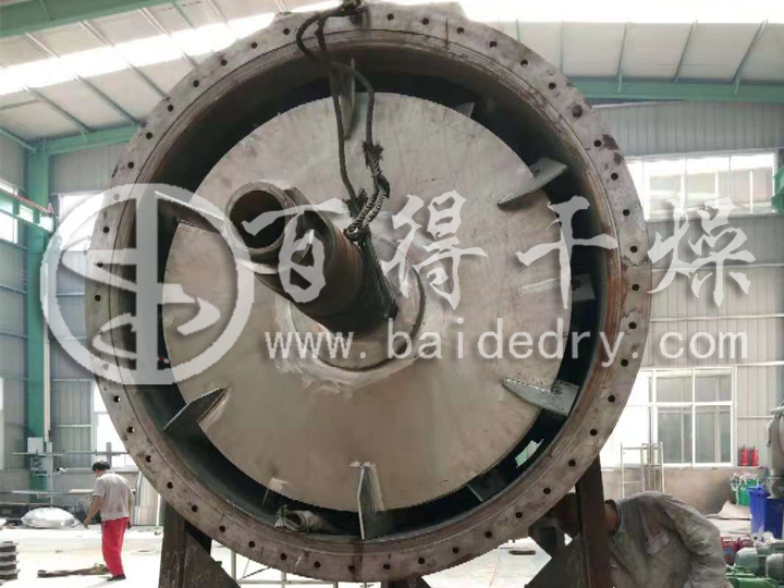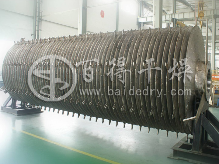 ② 轉(zhuǎn)盤中心軸是干化轉(zhuǎn)盤的承載部件,它是一個(gè)中空軸,所有的轉(zhuǎn)盤焊接在這個(gè)中空軸上。每片轉(zhuǎn)盤由兩個(gè)對(duì)扣的圓盤焊接而成。中心軸內(nèi)腔與所有轉(zhuǎn)盤內(nèi)腔相連通。為了提高轉(zhuǎn)盤的堅(jiān)固性,空心轉(zhuǎn)盤內(nèi)腔分布著許多鉚釘,鉚釘兩端支撐著左右兩個(gè)圓盤。