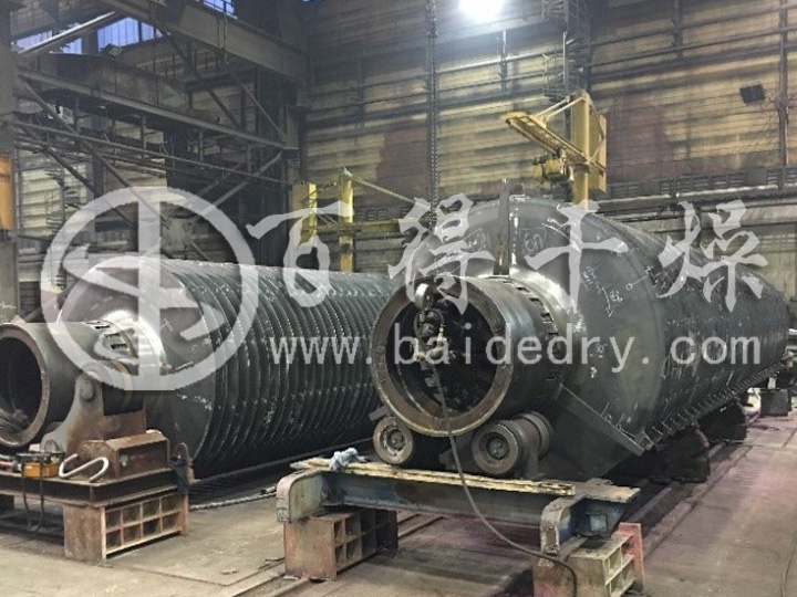 魚粉低溫真空干燥機的核心不僅為主軸結合件。主軸由無縫鋼管制成,其上等間距分布加熱盤管。為使加熱均勻,獲得高質量的魚粉,相鄰兩加熱盤管之間相差180°。主軸與軸頭連接盤焊接,軸頭與軸頭連接盤用螺栓連接,主軸內部有兩主軸內管,內管上焊接蒸汽分配管和冷凝水止回管,內管由內管支撐板支撐。蒸汽分配管與加熱盤管相通,使蒸汽能從進氣管進入到加熱盤管加熱干燥魚粉。干燥魚粉時存在熱交換,加熱盤管內的蒸汽變成冷凝水,冷凝水經冷凝水止回管進入主軸,由虹吸管和出冷凝水管排出。主軸內通預熱管結合件,用以預熱主軸,防止主軸因熱脹冷縮導致斷裂。加熱盤管上焊接有倒料板、炒料板及推料板,使魚粉由動力端往非動力端移動,并在移動過程中進行翻攪魚粉和延長魚粉在簡體內的停留時間,使魚粉得到充分、均勻干燥。
