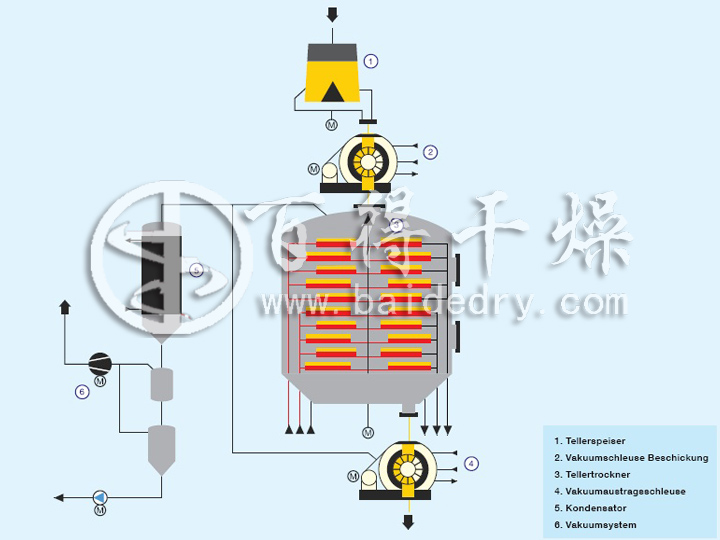 盤式干燥器(Plate Dryer)又稱圓盤干燥器,系一種多層固定圓盤、轉(zhuǎn)耙攪拌、立式連續(xù)干燥裝置,屬傳導干燥為主的接觸干燥器類。該裝置是在固定床傳導干燥器以及耙式等攪拌型干燥器的基礎上不斷改進發(fā)展而成的。德國Krauss Maffei公司于七十年代末期研制出盤式干燥器,并有系列產(chǎn)品。