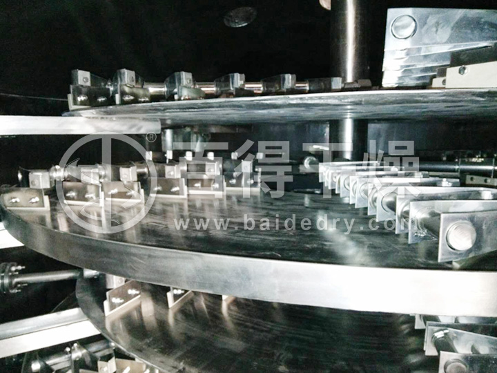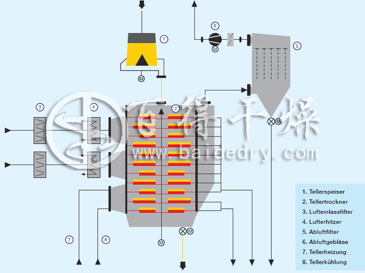 濕物料通過定量加料器均勻加到盤式連續干燥器的頂部,在干燥器中流過時完成干燥過程,從干燥器底部排出于物料。物料中逸出的濕分由干燥器頂部的排濕口排入大氣。