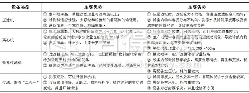 三元材料前驅體過濾洗滌設備的主要優勢和劣勢對比表