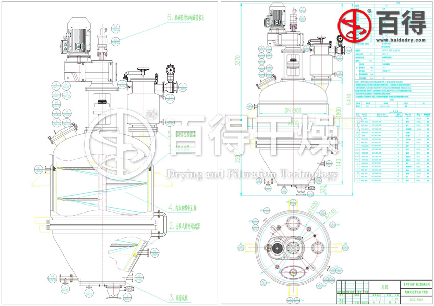 為了克服上述單元設備組合中存在的問題與不足,同時滿足三元材料前驅體生產工藝高品質、高效率的要求,我公司進行了大量的設計研發工作,終于研制成功了集過濾、洗滌于一體的多功能筒錐式過濾洗滌設備,具有過濾、洗滌主要功能,還兼有反應、萃取、結晶、濃縮、干燥、混合、破碎等多項功能,屬于改進型多功能設備。