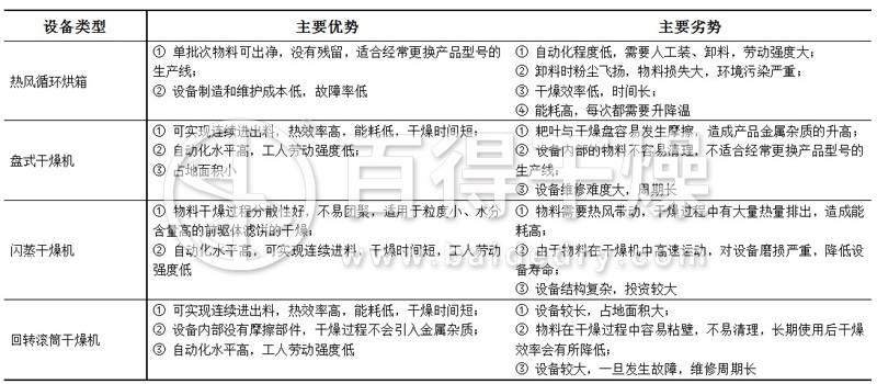 通過采用熱風(fēng)循環(huán)烘箱、盤式連續(xù)干燥器、閃蒸干燥機和回轉(zhuǎn)窯干燥器四種不同的干燥方式處理NCM523三元正極材料前驅(qū)體,結(jié)果表明前驅(qū)體的干燥方式對前驅(qū)體的形貌、振實密度、比表面積和粒徑分布等都有一定的影響,其中熱風(fēng)循環(huán)烘箱干燥處理的產(chǎn)品在球形度、表面規(guī)整度、產(chǎn)品一致性和細(xì)粉量等產(chǎn)品質(zhì)量指標(biāo)在一定程度上優(yōu)于盤式連續(xù)干燥器和回轉(zhuǎn)窯干燥器處理的產(chǎn)品。考慮到烘箱雖然適用性廣,但干燥時間長,熱效率低于其他兩種干燥方式,且自動化程度低,適用于中小批量生產(chǎn);而盤式連續(xù)干燥器調(diào)控容易、適用性強、熱效率較高且產(chǎn)品質(zhì)量也較穩(wěn)定,可使用大批量、連續(xù)化生產(chǎn);回轉(zhuǎn)窯干燥器自動化程度高、熱交換面大,可大批量生產(chǎn),但對進樣水分和頻率有一定要求,需要綜合考慮前端過濾洗滌設(shè)備的配置。