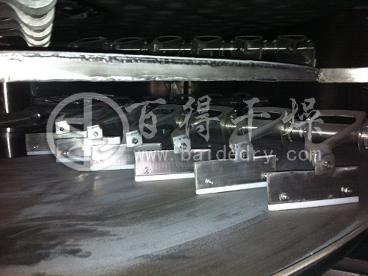 濕物料由加料器連續地加到干燥器上部^層干燥盤上,帶有耙葉的耙臂作回轉運動使耙葉連續地翻抄物料。物料沿指數螺旋線流過干燥盤表面,在小干燥盤上的物料被移送到外緣,并在外緣落到下方的大干燥盤外緣,在大干燥盤上物料向里移動并從中間落料口落入下一層小干燥盤中。大小干燥盤上下交替排列,物料得以連續地流過整個干燥器。中空的干燥盤內通入加熱介質,加熱介質有飽和蒸汽、熱水和導熱油,加熱介質由干燥盤的一端進入,從另一端導出。已干物料從^后一層干燥盤落到殼體的底層,^后被耙葉移送到出料口排出。濕份從物料中逸出,由設在頂蓋上的排濕口排出,從底層排出的干物料可直接包裝。