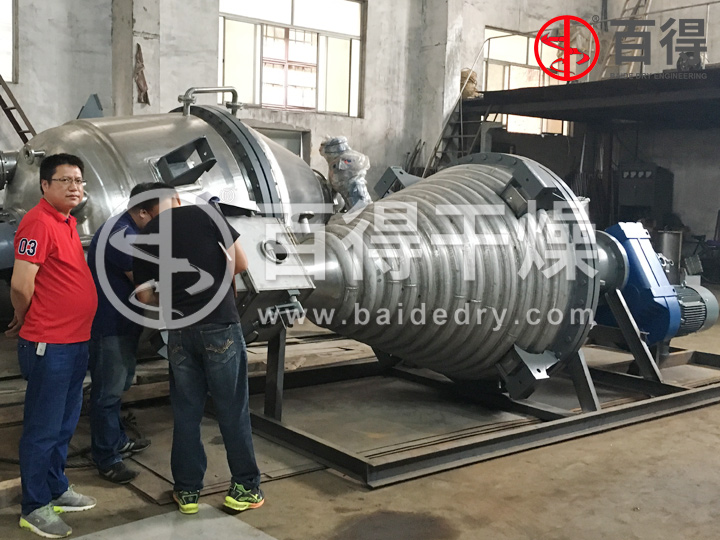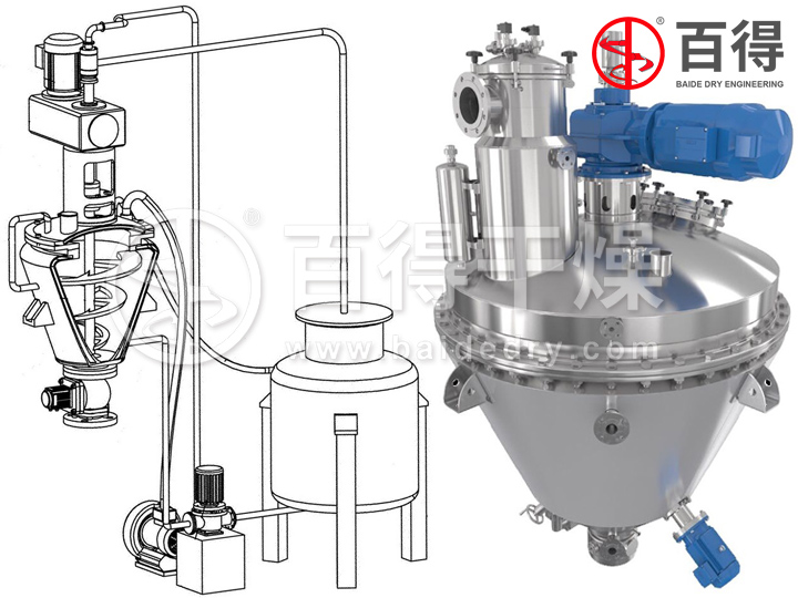 單錐真空干燥機裝載硬質合金粉末后,電機減速機驅動內加熱螺帶攪拌器旋轉,帶動物料沿錐形桶壁旋轉并自下而上提升,物料達到^高點后由于重力作用,自動流向漩渦中心回到筒體底部,從而實現自動混合之過程。同時物料在錐形筒體內被強制加熱,使物料作全方位不規則往復運動時完成物料同螺帶及筒壁的熱交換,在真空狀態下短時間內達到混合干燥的目的。