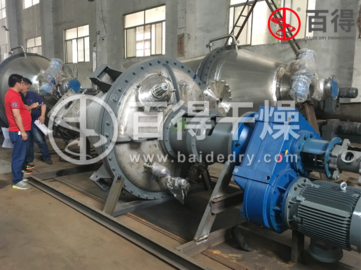 內加熱螺帶攪拌主軸轉速采用目前國際上較為先進的變頻調節技術來控制,調節平穩,任意轉速連續可調,而且節約能源。同時可較好地控制傳熱面積參數,防止物料的結塊,達到粉末制粒的目的。