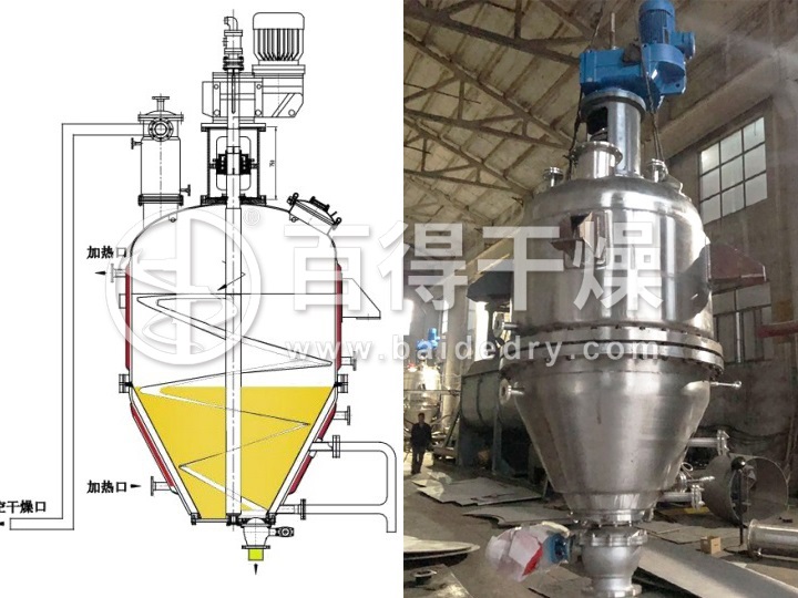 ③ 筒錐式結晶過濾洗滌干燥機是螺旋攪拌裝置由旋轉軸和固定在旋轉軸上的螺旋形葉片組成,旋轉軸由位于筒體頂端的動力機構驅動。