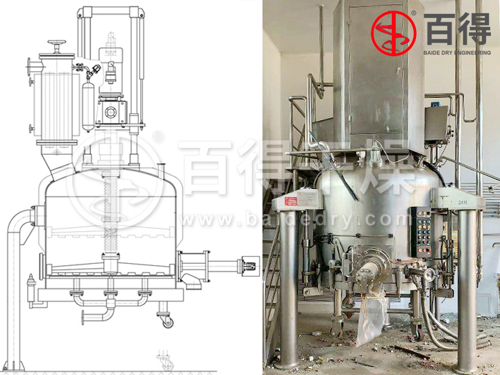 (4) 干燥:濾餅被攪拌漿葉逐層刮松,設(shè)備加熱裝置均勻?qū)V餅加熱,在真空狀態(tài)下用熱氣體對濕物料加熱,加速蒸發(fā),達(dá)到干燥目的;