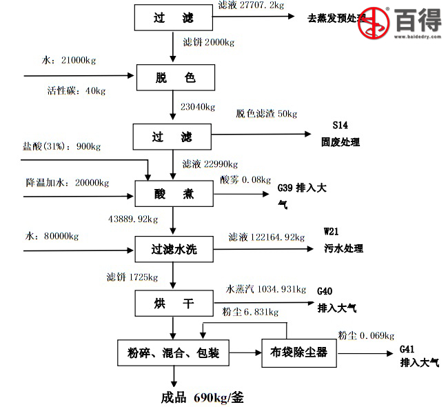 在打漿釜內加入計量好的水和鹽酸。在攪拌下投入烘干的物料升溫至 60℃保溫2小時,收率為94.9%。保溫時間到后將物料放入吸濾槽用熱水洗滌至中性(洗滌廢水去污水處理)后抽干,送入烘箱烘干,粉碎,包裝,入庫。烘干過程產生水蒸氣直接排入大氣,粉碎后產生粉塵經布袋除塵器處理后排入大氣,回收的粉塵摻入成品中,總收率為66.8%。