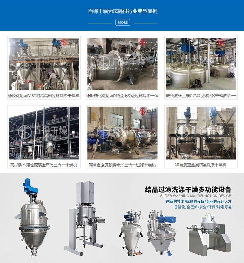 根據染料及染料中間體清潔生產、本質安全對先進的液固分離及干燥系統的工藝要求,百得干燥研制的全密閉反應結晶過濾干燥多功能設備集過濾、洗滌、溶劑回收、干燥和粉塵捕集于一體,過濾干燥效率高,操作方便。多功能過濾干燥設備性能明顯優于其它傳統的過濾干燥設備,具有如下優點: