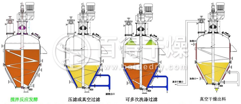 筒錐式反應(yīng)過濾干燥三合一是在同一密閉空間內(nèi),通過夾套控制溫度而進(jìn)行物料的加壓或真空反應(yīng)。反應(yīng)結(jié)束,對物料加熱真空濃縮后,降溫結(jié)晶析出反應(yīng)產(chǎn)物;啟動攪拌主軸,使下錐體過濾板對結(jié)晶后的固液混合物進(jìn)行加壓或真空處理,利用濾餅兩端的壓差以及攪拌螺帶壓榨的擠壓作用進(jìn)行固液分離;通入洗滌液,使濾餅中的反應(yīng)液進(jìn)一步脫出并清除雜質(zhì),固液分離過程結(jié)束可得到較干的固相物;啟動內(nèi)加熱螺帶,對物料加溫真空干燥zui終得到達(dá)到一定干度的產(chǎn)品。