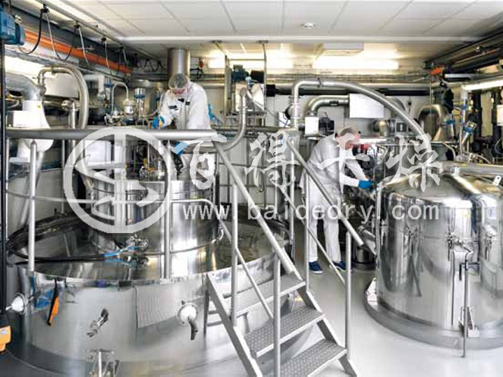 防爆閉路循環離心噴霧干燥系統處于封閉環境中,干燥介質以氮氣作為惰性氣體。干燥塔等氮氣正壓運行,如果內壓降低,壓力變送器可以自動控制氮氣輸入,保證系統壓力平衡。采用氮氣作為循環載體,對干燥的催化劑有保護作用,循環氮氣起載體、除濕、循環輸送的作用,而且可以再利用。然而傳統的離心噴霧干燥是通過連續供風和排風來達到除濕的目的,干燥工藝為負壓運行,這也是封閉式離心噴霧干燥系統和普通離心式噴霧干燥系統的防爆型差異明顯。因此防爆型閉路循環噴霧干燥機特別適用于有機溶劑材料的干燥、有毒材料、干燥中易發生氧化的材料的干燥。