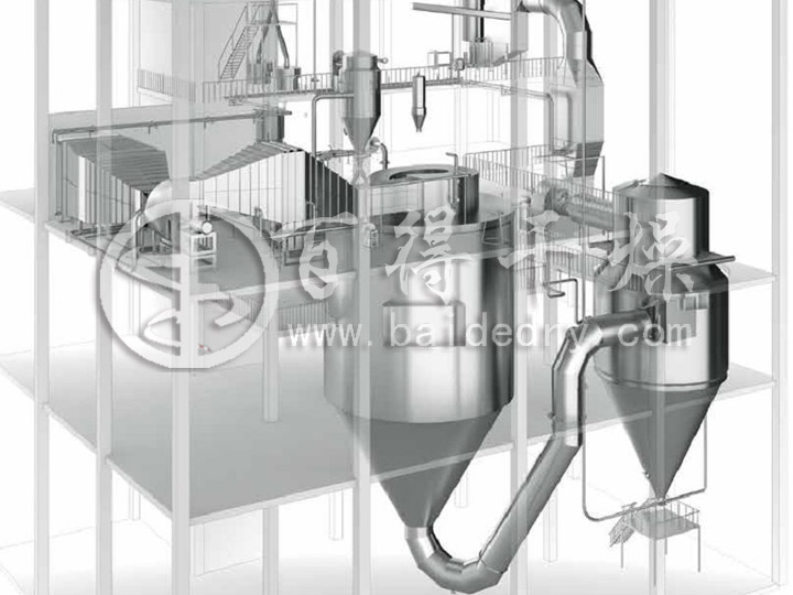 (4) 干燥塔:完成霧滴中的溶劑蒸發形成粉體的容器,由熱風分配器,塔體骨架,內膽,保溫層及燈孔,人孔,出料口,防爆卸壓口等組成。塔體內膽有氣密性要求。