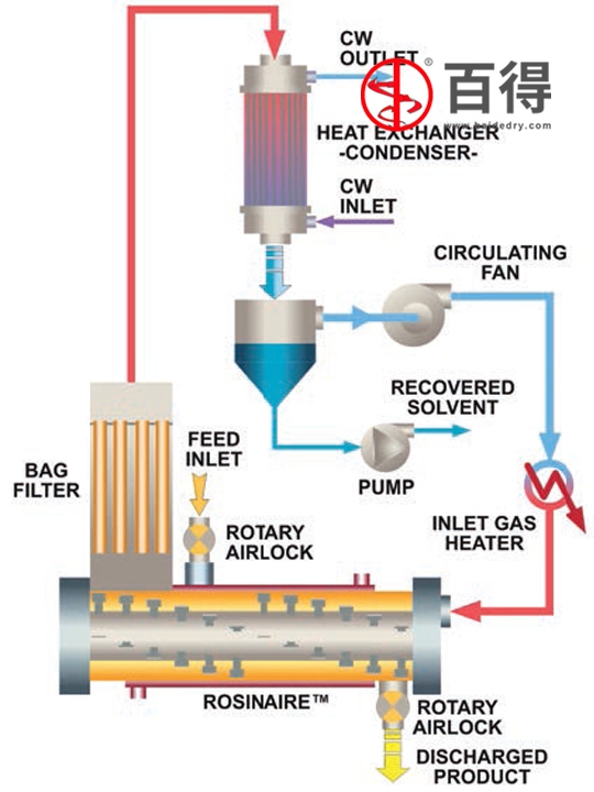 設備工作時,高含水物料通過外部定量加料裝置進入設備后,在攪拌軸的高速旋轉作用下,物料被很多平直槳葉攪拌、拋起并處于離心狀態,同時與筒體內壁充分接觸傳熱,并逐漸向出料端運動。在整個過程中,物料的水分被逐漸地蒸發,以達到zui終的干燥效果。蒸發的水氣在設備內部干燥熱空氣的帶動下,經過濾裝置除塵后進入回收系統,二次循環利用。整個設備充分利用了傳導接觸傳熱和對流傳熱的優點,同時利用熱氣回收以達到節能減排的目的。