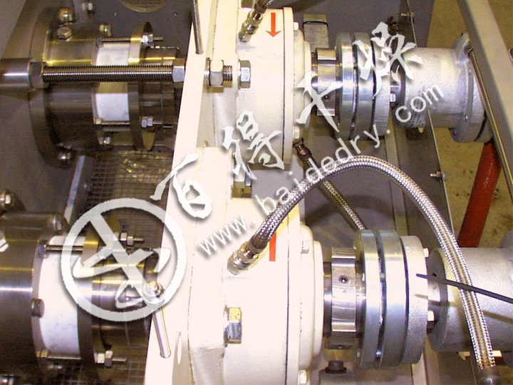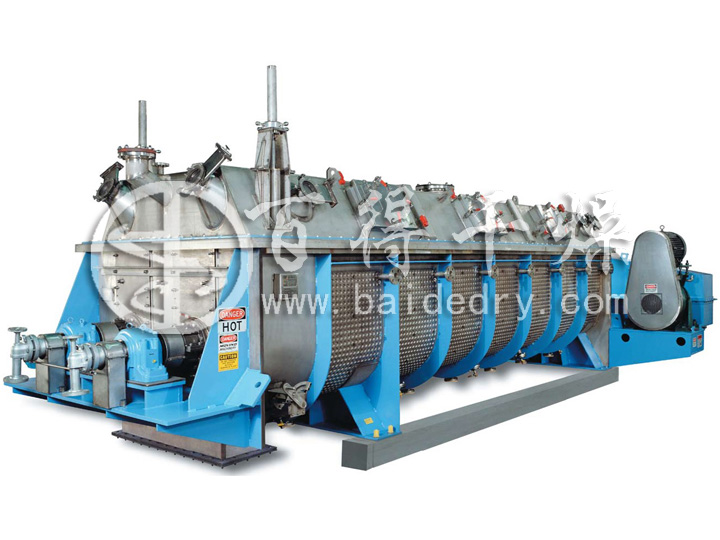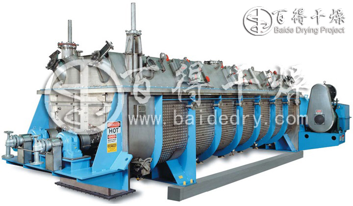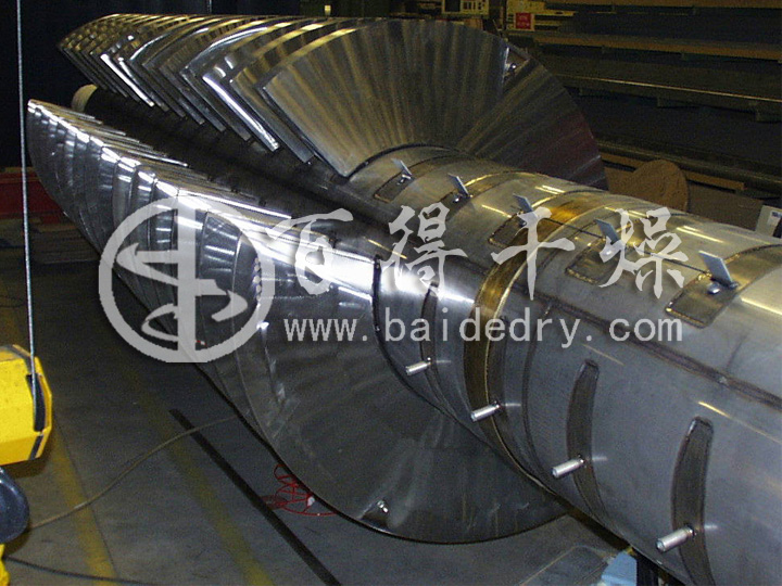 有些濕物料粘度高,流動性差,為了使這類物料向前流動,普通槳葉干燥機安裝時設備整體向出料口方向成一定傾角,但是當設備傾斜放置時 不能很好控制物料的流動速度,這樣很難控制物料干燥水份,為了提高濕物料在槳葉干燥機內部流動性,對槳葉的外部結構作了一定的改動,使槳葉對物料有向前推進作用。改變槳葉軸轉速就可控制物料的推進速度,使物料有一個合理的推進速度,保持物料在設備內部有一個合理的料位,使物料與槳葉表面充分接觸,進一步提高傳熱面積。