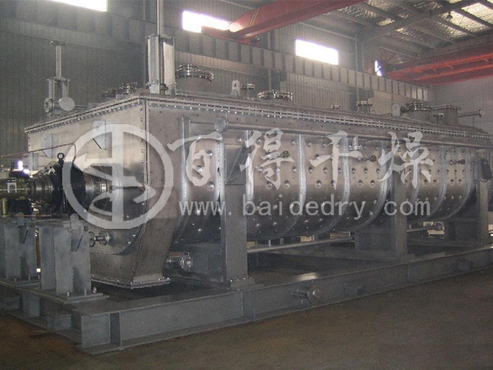 當干燥到含水率60%左右時,物料極易結塊、表面堅硬、難以破碎、而里面卻仍是濾餅狀,這給類似物料的進一步干化帶來極大的困難;另一方面在干燥類似物料過程中,物料容易抱軸,從而把槳葉和軸的散熱面包圍 轉動時一起運動,這樣干燥的效果比較差。為了克服這個困難,我們又對干燥機進行了改進,在筒體內部增加一些裝置,使結塊后的物料容易破碎,從而干燥速度大大提高。