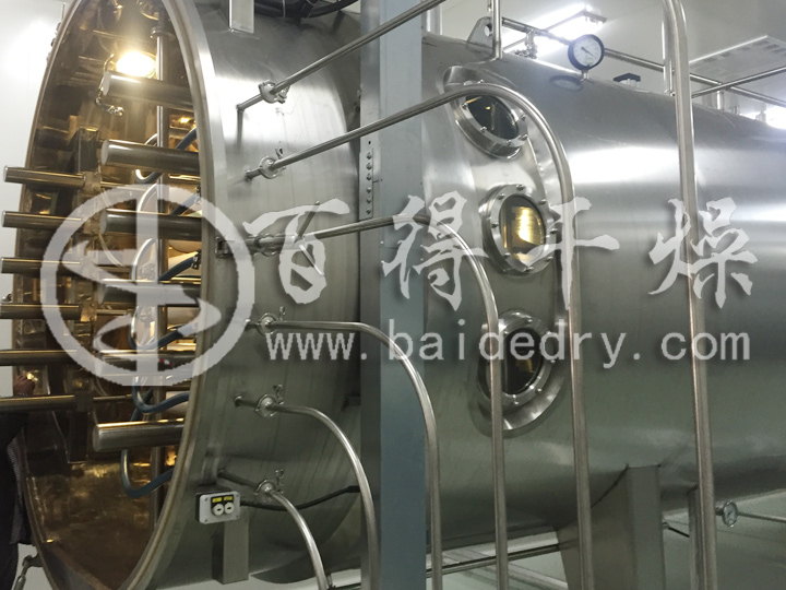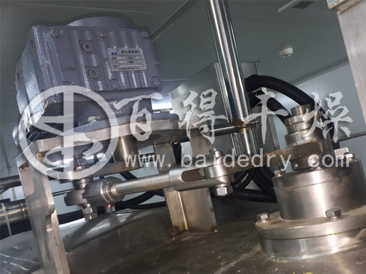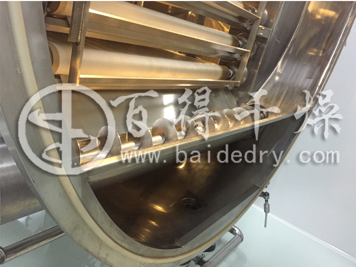 干燥室體是一個嚴格要求密封的不銹鋼容器,使用時抽出其內空氣形成真空,其形狀一般為圓筒形或方箱形。進料機構一般由原料槽、閥門、輸送泵(可用蠕動泵或計量泵),軟管、噴嘴和噴嘴拖動機構等組成。液態和漿狀物料可以由計量泵傳輸到干燥室內,固態、片狀物料則需要有專用的真空進/吸料設備來完成進料過程。液態、漿狀物料進料前一般應經過真空濃縮,提高其固形物含量達到50%左右再進行真空帶式干燥,以達到節約能源、得到更高干燥效率的目的。傳送帶是承載、輸送物料的裝置,其材質應滿足真空干燥工藝。干燥室內傳送帶數可以為一條,也可以是多條。加熱板提供給被干燥物料蒸發水分所需的熱量,冷卻板使已干燥的產品降溫,便于剪切出料。剪切機構就是將物料切成小塊狀,便于粉碎和出料。出料時的情況是干制品達到一定量后打開成品倉上面的閘板閥(開啟前已將成品倉抽過真空),將粉碎后的產品顆粒放入成品倉,然后關閉該閘板閥。如此反復,將干燥、粉碎好的產品一批一批地存入成品倉內。當其成品達到一定量或干燥工藝結束時,開啟成品倉下面的閘板閥排放出成品。