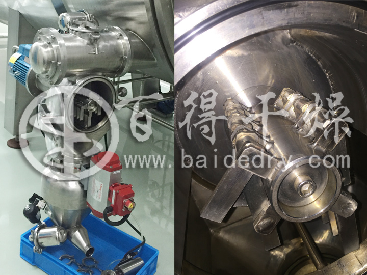 出料機構是由破碎機、螺旋輸送機、上閘閥、中間罐、下閘閥和收料桶組成,破碎機采用動刀和靜刀組合結構,是將經剪切的塊狀或條狀物料,經破碎后進入螺旋輸送機,當中間罐的物料積存到一定量后,關閉上刀閘閥,將三通閥置于充空氣位置,中間閥充空氣后,此時中間罐恢復常壓,則開啟下刀閘閥,放出成品物料,然后關閉下刀閘閥,對中間罐抽真空,當中間罐的真空度與筒體真空度基本平衡時,再打開上刀閘閥,如此反復、循環操作。破碎速度和螺旋輸送速度采用變頻調速,刀閘閥采用氣動控制,可任意設定開閥和關閥的速度和時間,從而調試出^佳的操作周期。