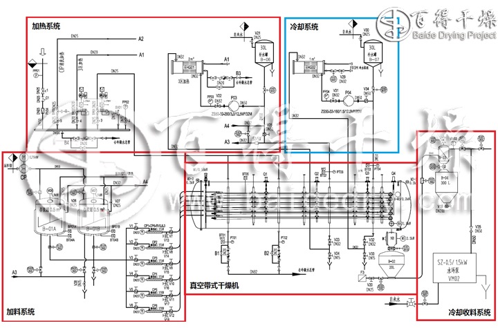 真空帶式干燥機主要由真空系統、帶式干燥機、加熱系統和控制及測量系統等組成。
